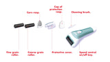 Included in the package are: fine grain roller, coarse grain roller, callus rasp, protective cover, rasp protective cap and wall power supply.