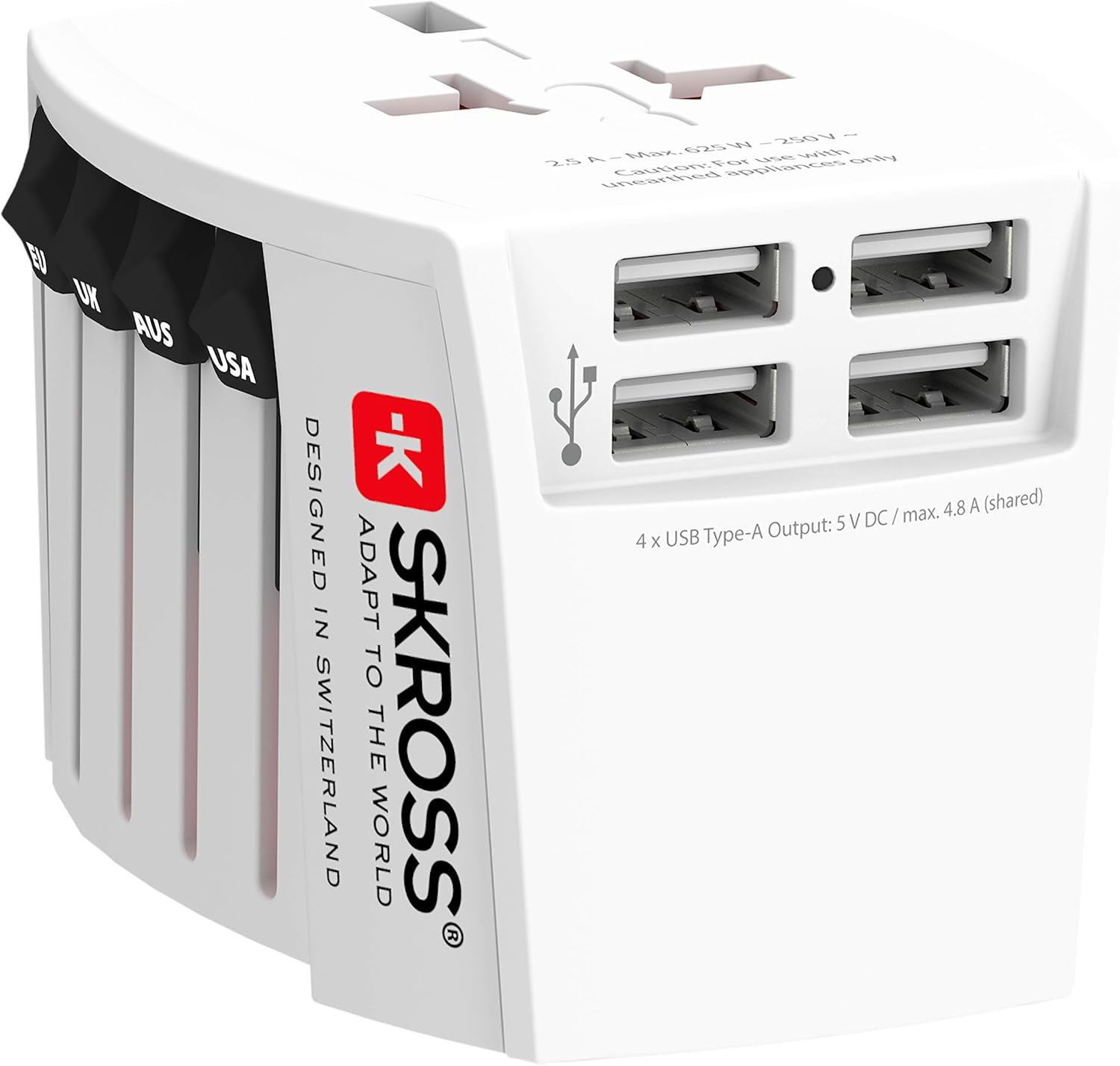 - SKROSS | MUV USB (4xA) | Anti Shock - KID SAFE. Innovative 2-pin universal travel adapter with 4 built-in USB ports.