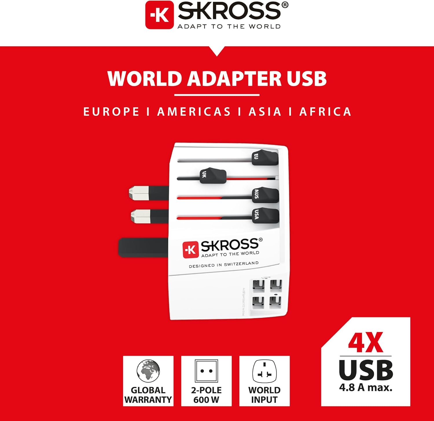 - Description: With the universal MUV USB adapter (4xA) from SKROSS travelers worldwide can charge four USB devices and connect a 2-pin device at the same time. The travel adapter comes in an attractive compact shape and can be used in over 220 destinations around the world.