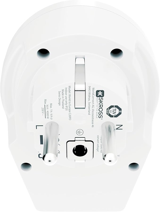 Our travel adapter for the Skross Country Travel Adapter from the world to USB C20PD Europe offers travelers safe, reliable and easy connections when connecting 2 and 3 pole devices simultaneously.