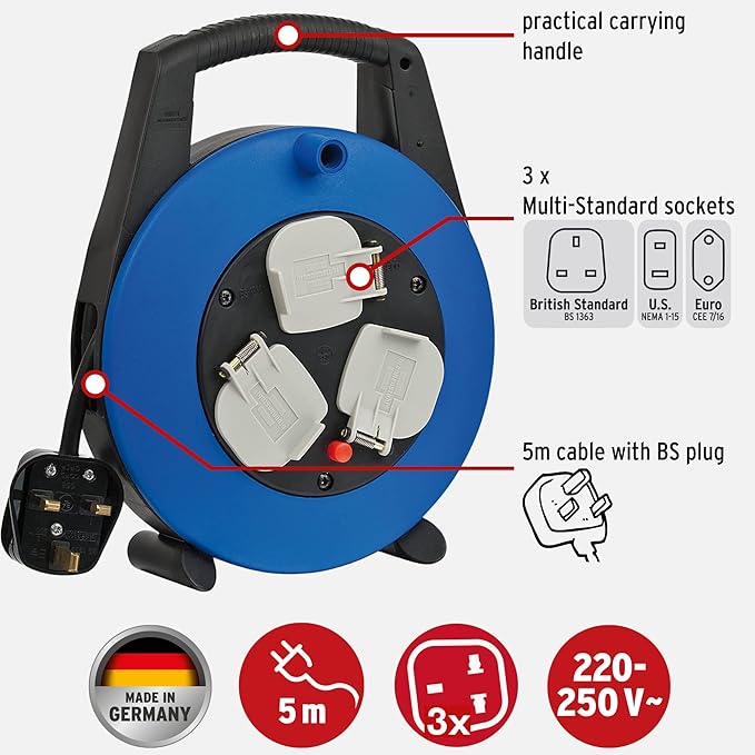 Brennenstuhl 1098207900 Vario Line Multistandard 3-way socket cable box (sockets fitting for BS, U.S. and EURO plugs), portable 5m extension cord in plastic box with carrying handle, Made in Germany