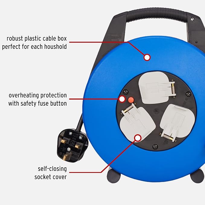 • Robust cable box (240 V/13 A) with thermal cut-out protection against overheating and overloading, anti-dust and contamination self-closing socket cover