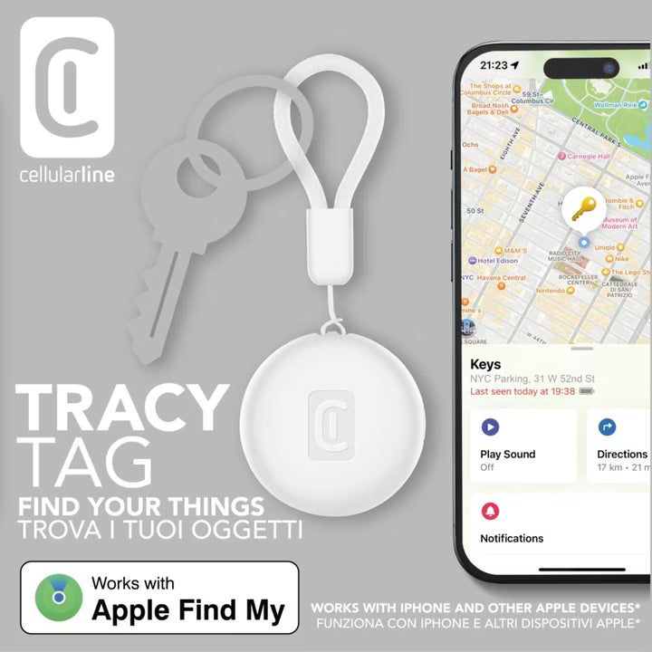 TRACY TAG is the perfect device for anyone who wants to keep their personal belongings such as keys, wallets, backpacks and suitcases always under control. With a compact design, similar in size to an Apple AirTag, it is compatible with all accessories designed for it, allowing seamless integration into your lifestyle. Using Apple’s Find My app already installed on your devices, TRACY TAG lets you easily track both nearby and distant items. When you are close, you can make the device ring with a simple tap on your iPhone, while for items outside Bluetooth range, you can view them on the map and receive directions to find them. This tracker features a replaceable CR2032 battery with a lifespan of about one year, so you can monitor your belongings without worries. The battery level can be checked directly in the app, so you always know when it’s time to replace it. TRACY TAG is also IP65 certified, making it resistant to dust and water splashes. Easy to set up via the Find My app, TRACY TAG is a versatile and practical solution to keep track of your favorite items at all times.
