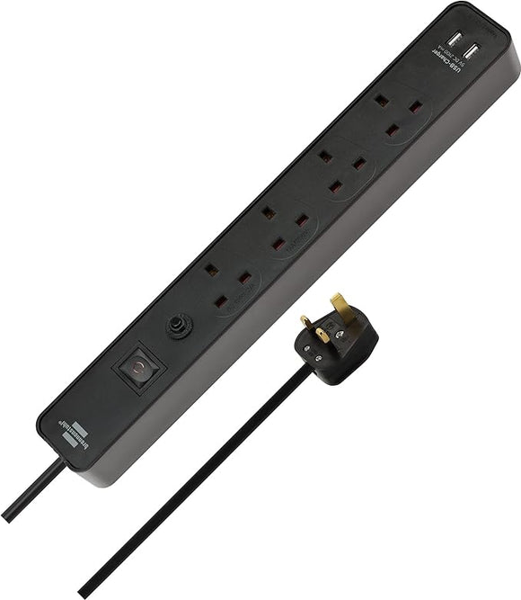Brennenstuhl 1153243006 Ecolor extension lead 4-gang with 2 USB ports (Power strip 4-way with safety fuse button and 3m cable and switch, 90° angle of sockets)