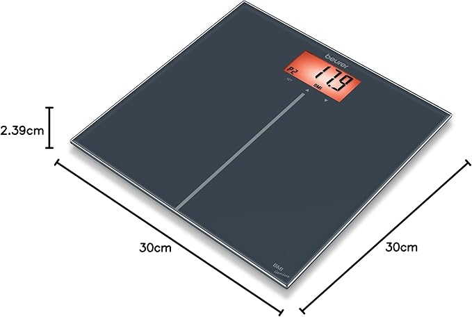 The glass bathroom scale offers a wealth of clever functions. It calculates your BMI and shows your BMI classification directly on the multi-coloured display.