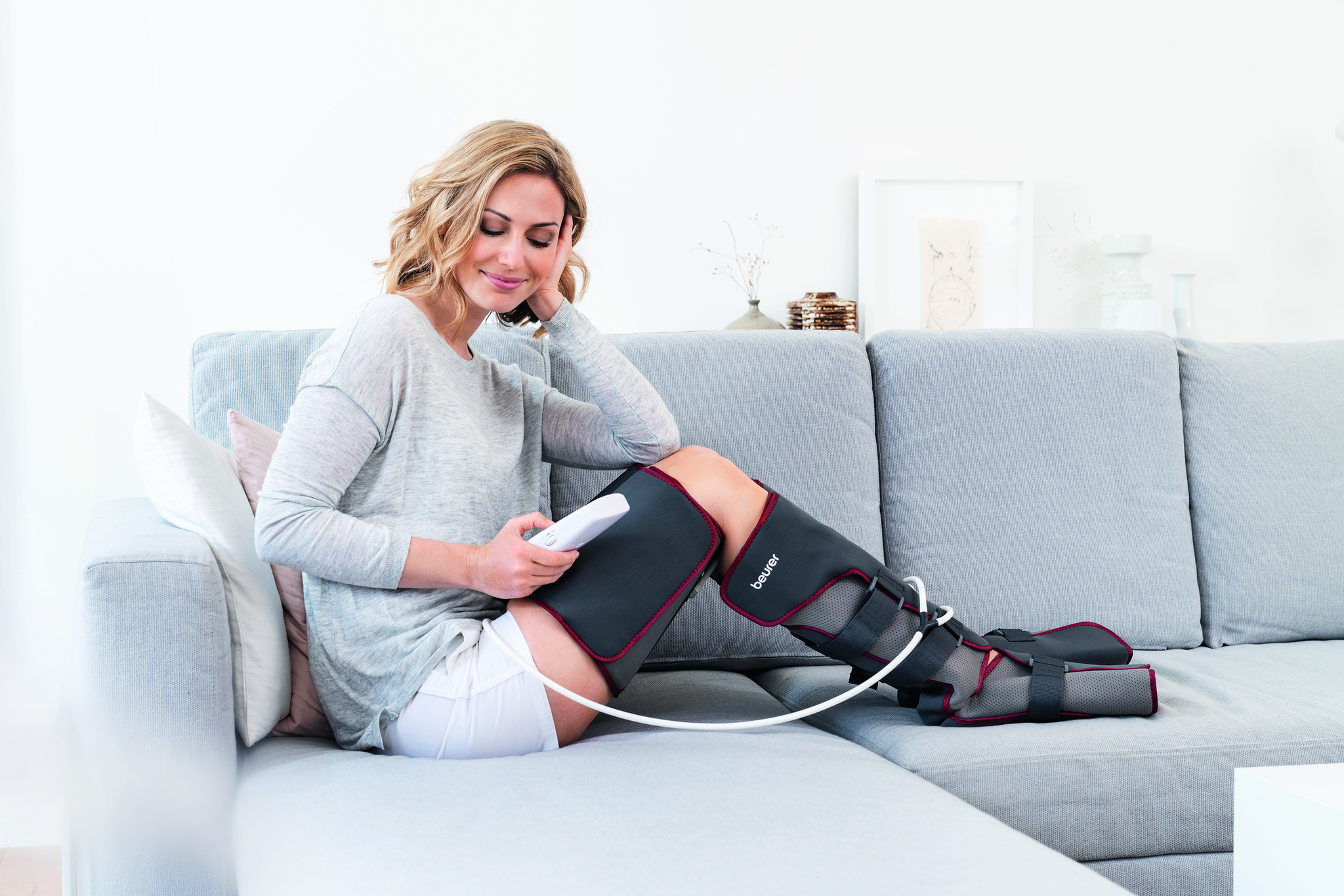Tired and heavy legs can be relieved with the leg compression massager. It improves blood circulation and releases tension. The leg cuffs are inflated alternately; the air cushions are quickly emptied again using the deflation function.