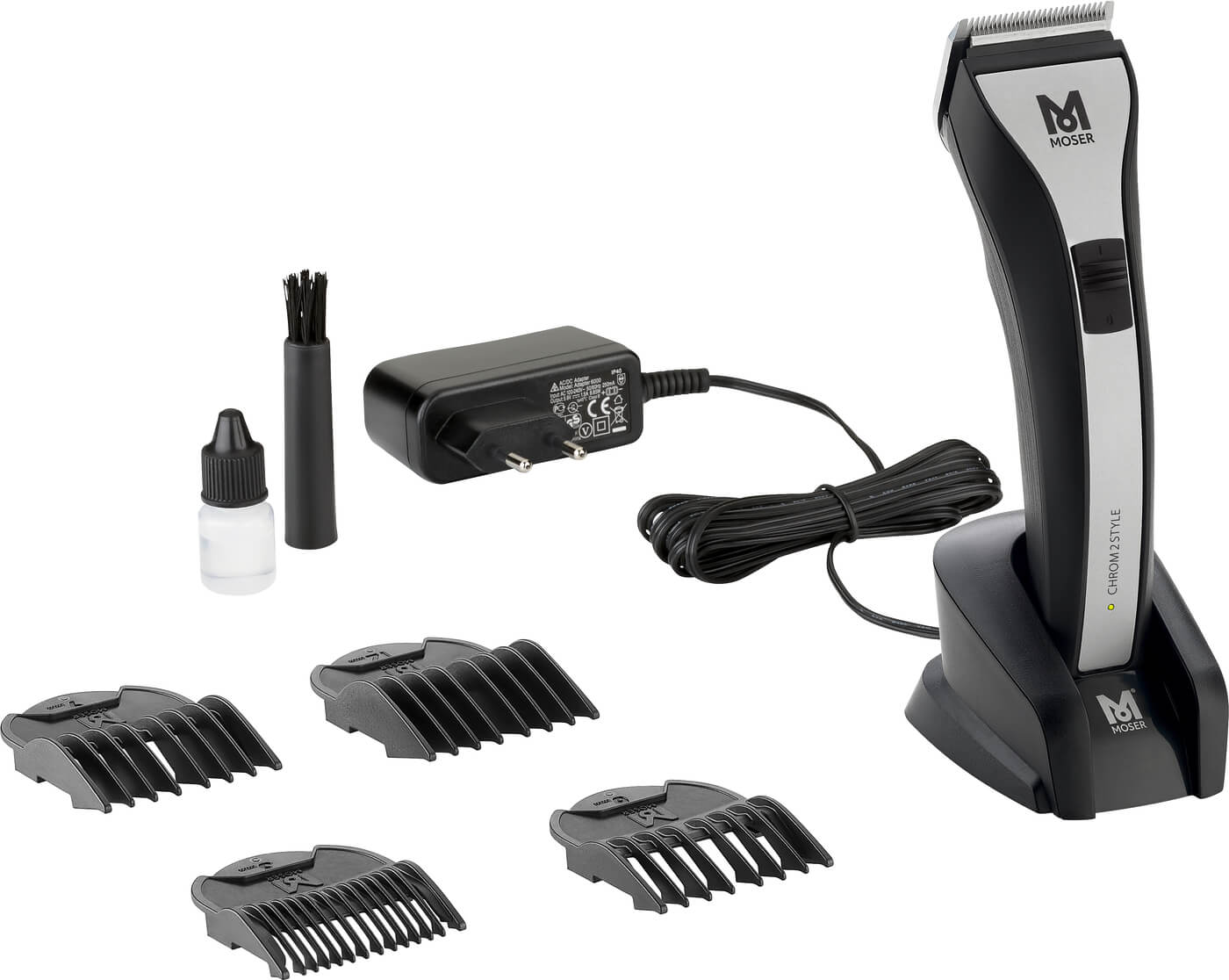 INCLUSIVE:4 slide-on attachment combs 3, 6, 9, 12 mm, charging stand, plug-in transformer, cleaning brush, oil