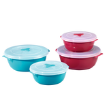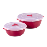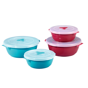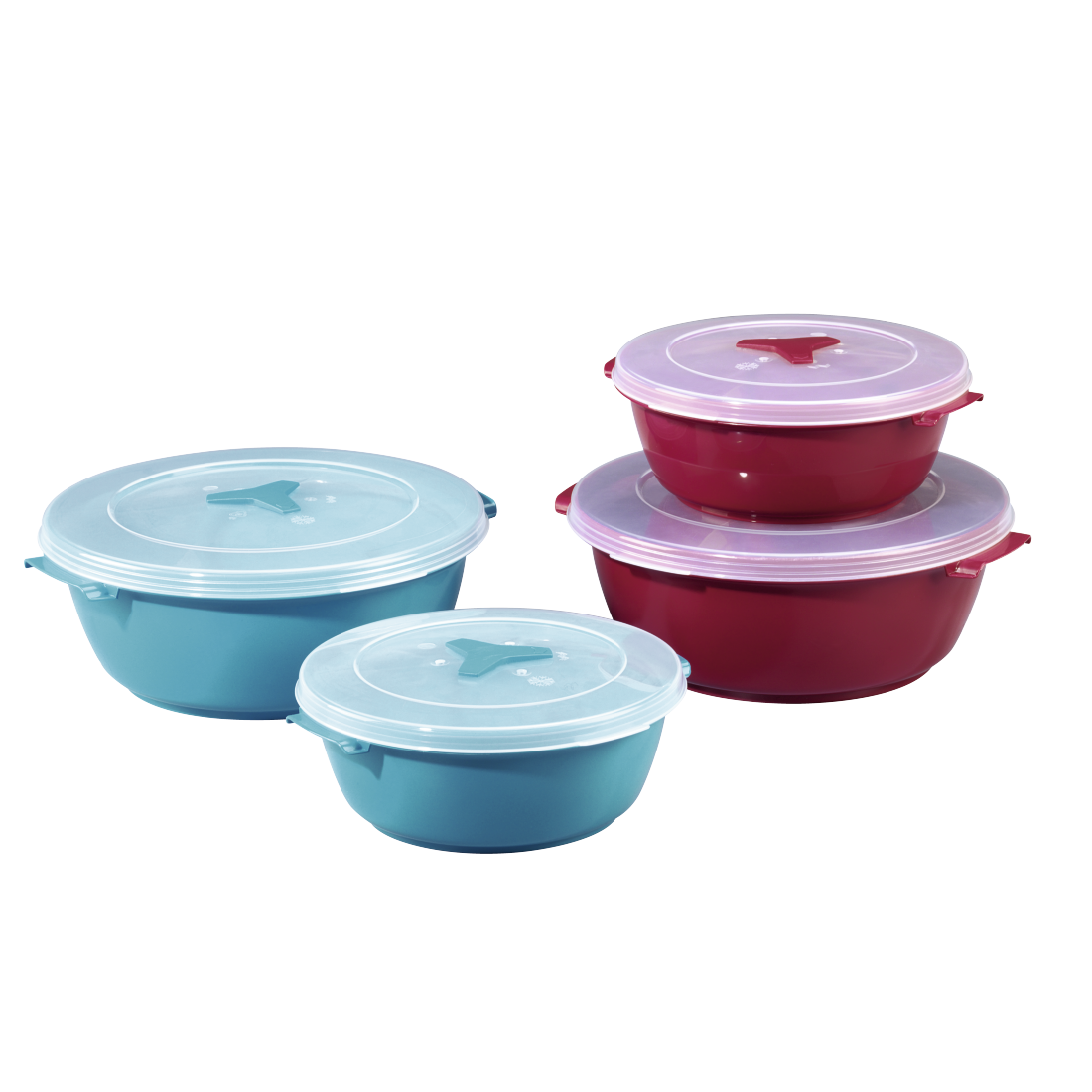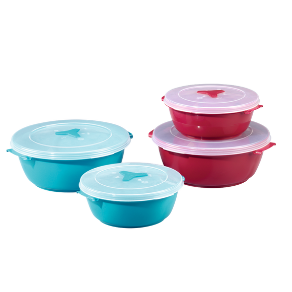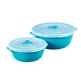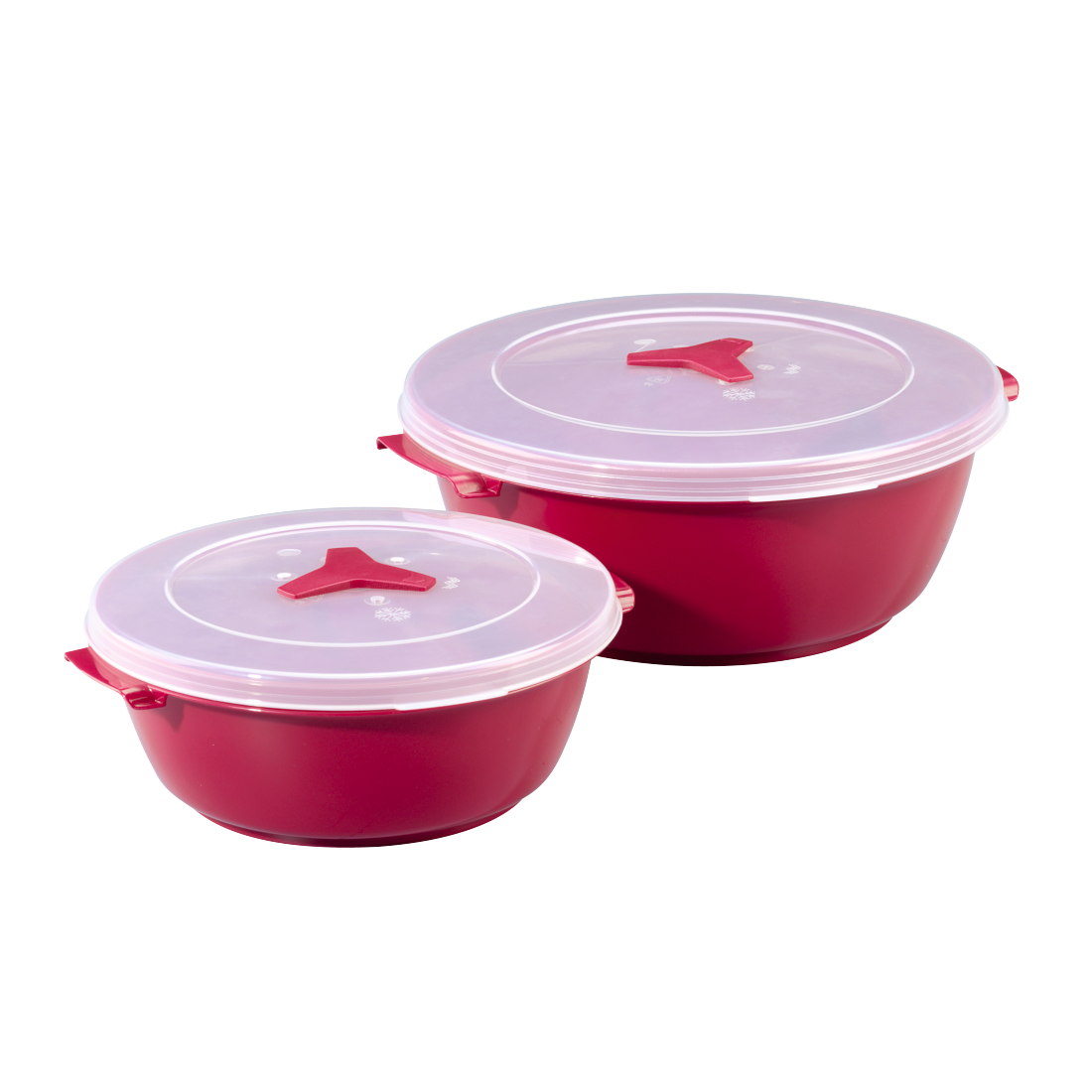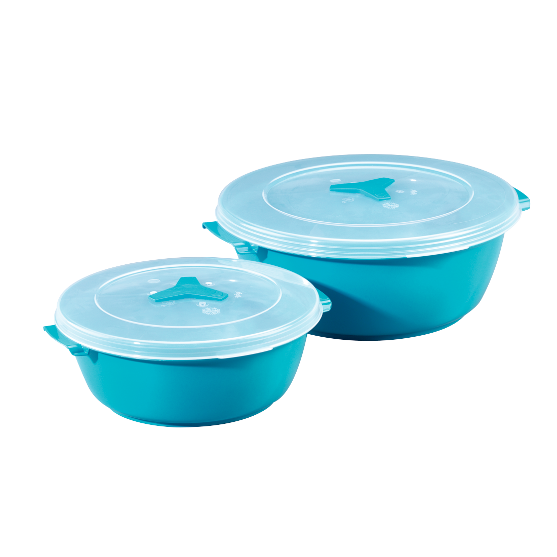 - Comprises 2 containers with matching lids (diameter 24 x 9 cm, 2L and 21 x 9 cm, 1L) in burgundy or turquoise